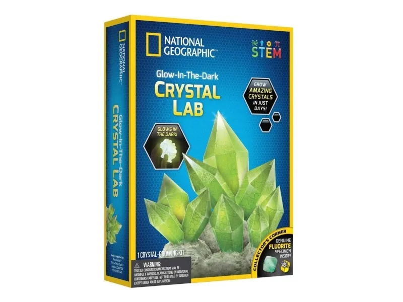 National Geographic's Glow-in-the-Dark Crystal Lab er et fascinerende og sjovt videnskabeligt eksperiment. Børn kan gro en krystal på bare et par dage og så forbløffet se på, når den lyser i mørket! Den medfølgende læringsvejledning er fyldt med interessante fakta om krystaller og den indeholder endda en ægte fluoritprøve. Det er det mest omfattende krystalsæt på markedet! Dette naturvidenskabssæt inkluderer gropulver til at gro krystaller, en glød-i-mørke krystalkim, træske, et forstørrelsesglas, udstillingsfod, en ægte fluoritkrystal og National Geographic læringsvejledning med instruktioner. Det er det perfekte projekt for børn og er en god introduktion til geologi og kemi! Få dit Glow-in-the-Dark Crystal Lab i dag og opdag utrolige, glødende krystaller!