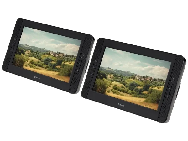 Bærbar Twin DVD-afspiller Bærbar DVD-afspiller med 25,4 cm (10) LCD-skærm og ekstra 25,4 cm (10) skærm, så du kan se den samme film på begge sider AV-udgang til forbindelse med eksternt TV Hovedtelefonervenstre, AV-indgang, USB og SD-kortlæser Fjernbetjening Indbygget litium-batteri (ca. 2 timers afspilning pr. opladning) Praktisk bæretaske, der også fungerer som holder i bilen.
