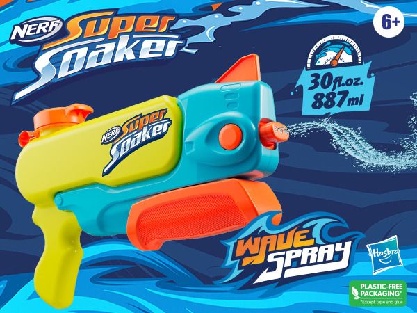 Product type- Toy water sprayer. Brand- Hasbro Nerf Super Soaker. Article- F6397. Colour- Yellow. Material- Plastic. Caution for Toys- Not suitable for children under 3 years old., Remove all packaging and fasteners before passing this toy on to a child. It is recommended to keep the information on the packaging. Recommended for use under adult supervision. There may be small or sharp parts that could choke or injure the child.. Recommended age from- 6 y.